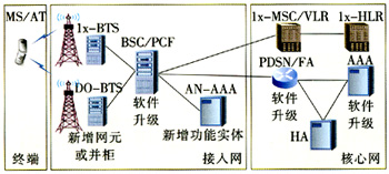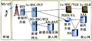 对于已存在1x网络的运营商的另外一种选择就是DO与1x混合组网,即在1x基站上增加DO信道板,并对原有的1x系统软件进行升级,两者共用1x的分组核心网。接入网则又可分为升级组网方式和叠加组网方式2种。