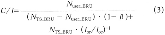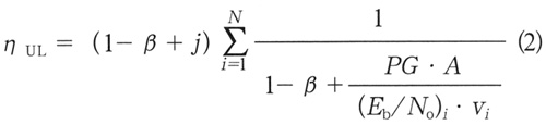 式中:β表示联合检测的多址干扰消除因子;j为邻本干扰比;N为小区内业务连接数;PG与βEb/No分别为该速率等级业务的扩频处理增益和接收信噪比;Vi则为该业务的业务激活因子;A则为智能天线的抗干扰因子。