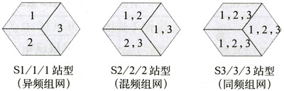 小区多频点概念优势不仅在于提供系统更高容量及资源利用率,且对TD系统同频组网时的公共与业务信道覆盖匹配及干扰消除等性能亦为极大增强。 2.1 公共与业务信道覆盖匹配 在单频点TD系统内,P-PCCPCH及DwPTS等公共信道是与业务信道时分共享基站功率资源的,由于其包含有广播及导频等公共信息,需向全小区用户发射,因此这些公共信道发射采用的是全向赋形,没有智能天线的波束赋形增益,由此造成TD小区覆盖可能受限于公共信道的情况。而小区多频点配置时,N个Carrier共用一套2W射频功放,如目前大唐可做到3载频共用一套,3频点业务信道平均分配2W功率资源,而公共信道则由于仅在一个Carrier上发射而独享2W功率,由此无形中为公共信道提供了约5dB的附加增益,弥补了其全向赋形的缺憾,提升其与业务信道覆盖的匹配性。 2.2 干扰消除 TD单载频组网时,缺少智能天线抗干扰特性的公共信道易引起小区间干扰,而多频点的引入可通过频率资源的有效分配而降低该干扰的影响程度。例如启用5MHz的频谱资源,包含3个TD频点,其可用站型配置为O1~O3、S1/1/1~S3/3/3:O1~O3为包含1~3载频的全向站,S1/1/1~S3/3/3则为每小区分别容纳1~3载频的三扇区定向站型,其可通过在不同小区内设置相隔的主载频来规避公共信道干扰,即分别对应于异频、混频及同频组网模式。各定向站型主载频配置如图2所示。