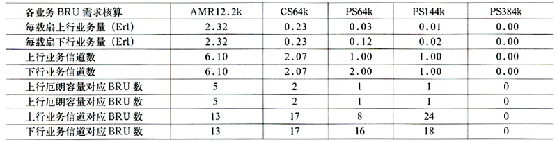 表9中,例如SF16×2code×1TS/QPSK的码道配置,可理解为:SF16~扩频因子为16;2code~单时隙上需这样的码道数为2;1TS~无线子帧中需占用1个时隙;QPSK则为该业务的基带调制方式。通常我们将一个扩频因子为16的码道定义为一个BRU(Basic Radio Unit,基本信道单元),在TD系统5ms的无线子帧中上下行业务信道共含96个BRU资源。而上下行各业务扩频因子虽不同,但其占用资源均可折算为BRU的倍数,例如:上下行AMR12.2k业务分别占用的BRU数均为2个,而PS144k上行占用BRU为24(QPSK)/16(8PSK)个,下行则占用为18个BRU。因此,容量配置及时隙比例规划均可转化为对BRU资源占用情况的分析上。而由于CS域及PS域业务QOS不同,通常PS域为“尽力而为”的非实时业务,因此其容量配置策略为:首先依据CS域实时业务的实际爱尔兰容量,按呼损要求,通过Erlang B公式计算出信道需求,再将该信道数对应的总BRU数减去CS域业务实际容量所需BRU,而该部分BUR差值则可用于PS域数据业务,并根据需要增补必要的BRU资源给PS域业务[5]。