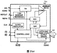 MAX165/166用片选信号CS和读信号RD可以很容易控制转换的开始和数据的读取。而信号BUSY则表示转换的开始与结束。由于转换数据以三态锁存的方式缓冲输出,因此MAX165/166能直接挂到µP的数据总线或系统I/O口上。MAX165/166的引脚如图1所示。内部原理框图如图2所示。