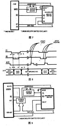 在ROM方式,µP不需插入一个待状态,其时序如图6所示。当RD和CS为低电平时,读操作有效,上一次的转换数据被读取,同时开始新的转换。转换开始时,BUSY信号变为低电平,表示转换正在进行。在BUSY变为低电平以前而RD变为低电平以后第3个时钟的下降沿,T/H采样模拟信号。转换结束时,BUSY变为高电平。再一个读指令将该次转换的数据并启动下一次转换。注意,在BUSY恢复高是怦以前,RD和CS不能变低,否则不能启动转换,因此,只有在BUSY变为高电平以前,才可以对MAX165/166进行一次读操作。ROM接口方式的连接图如图7所示。