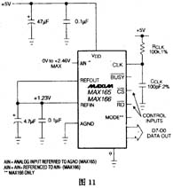 为了减小转换误差,MAX165/166要求基准源有小的直流和交流阻抗。MAX165/166的基准源分为内部基准源和外部基准源两种。外部基准源电路如图10所示。滤波电容可以有效地减小基准源的AC内阻。MAX165/166内部有一个1.23V的能隙基准电压,为了减小基准电压的内阻,通常在 REFOUT端与地之间接一个钽电解或铝电解与一个0.1µF的瓷片电容并联。如果选用外部基准,可把REFOUAT端接至VDD端,以禁止内部基准。