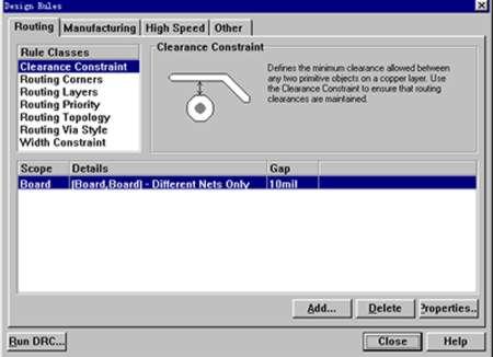 布线规则是设置布线的各个规范(像使用层面、走线宽度、安全间距、过孔大小、布线的拓朴结构等部分规则)可通过Design-Rules 下的 Menu链接从其它板导出后,再导入PCB板,这个步骤不必每次都要设置,按个人的习惯,设定一次就可以。
