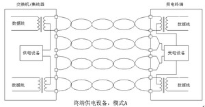 供电设备支持两种以太网供电模式,分别命名为模式A和模式B:模式A采用以太网线缆中的1,2,3,6 四根数据线(注:1,2线为发送数据线,3,6线为接收数据线)来传输电源,模式B则采用以太网线缆中的4,5,7,8 四根空闲线来传输电源。终端供电设备的下行链路可以采用模式A,或模式B,也可针对不同的链路分别采用两种模式。并且这类设备可以兼容十兆,百兆,乃至千兆的以太网。值得注意的是:在实际使用中,终端供电设备不应同时以A和B两种模式向同一条以太网链路上传输电源,一条以太网链路在同一时刻只会工作在一种模式下。而对于中间供电设备而言,一般只采用以太网线缆中的4,5,7,8 四根空闲线来传输电源,即只能工作在模式B,并且目前的标准还不支持千兆以太网。