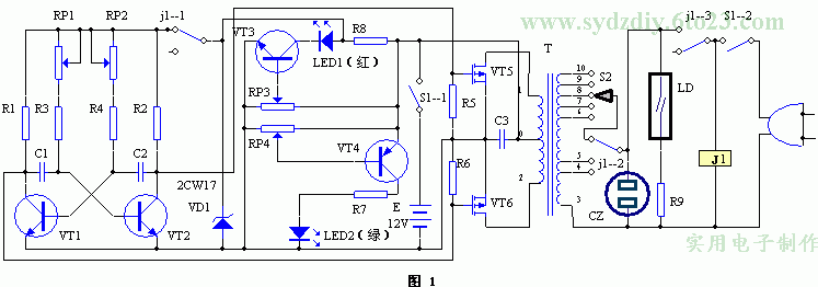 本装置电路简单,易于调试,性能可靠,逆变和充电自动转换,带电瓶电量指示。由于使用了大功率VMOS管,故效率高而成本又较低,适合电子爱好者组装。 工作原理 电路工作原理见图1(点击下载原理图