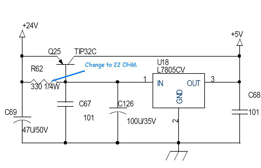 图为在非常流行的经典电路上做小许改动的电路图. 电路目的: 1)+24V 转换为+5V +/-5%2)可提供+2A以上的电流.主要元件: TIP32C (ST)L7805CV (ST)图中的R62,在实际应用中已经更改为22 OHM.功率元件TIP32C已经加散热片