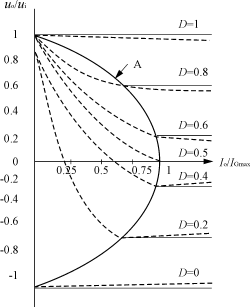 3.2.1理想情形(r=0) 由式(4.b)可知,理想情形且CCM模式时变换器的外特性为Uo=(5) 滤波电感电流临界连续和DCM模式时一个开关周期内的原理波形,如图5所示。 由图5(a)可知,t2-t1=DTs/2。t=t1~t2时,有uiN2/N1-uo=Lf=Lf=Lf(6) 电感电流临界连续时的负载电流为IG=Iomin=iLf(t2),由式(5)、(6)得IG=D(1-D)(7) 由式(7)可知,当D=1/2时,IG达到最大值,即IGmax=(8) 由式(7)、(8)可知,理想情形且滤波电感电流临界连续时变换器的外特性为 IG=4IGmaxD(1-D)(9) 由图5(b)可知,t3 t=t2~t3时,由图4(b)所示等效电路可知(r=0)uiN2/N1+uo=-Lf=-Lf=Lf(11) 由式(10)、(11)得t3-t2=(12) 输出负载电流为io==(13) 由式(8)、(10)、(12)、(13)得Io=IGmax(14) 因此,理想情形且DCM模式时变换器的外特性为=(15) 3.2.2实际情形 实际情形时,变换器的内阻r不为零,因此变换器的外特性可由式(4.b)表示。 取N1/N2=1,由式(5)、(9)、(15)、(4.b)可得变换器的标幺外特性Uo/Ui=f(Io/Iomax),如图6所示。曲线A为滤波电感电流临界连续时外特性曲线,由式(9)决定;曲线A右边为滤波电感电流连续时外特性曲线,实线为理想情形时曲线,由式(5)决定,虚线为实际情形时曲线,由式(4.b)决定,可见随负载电流增加,输出电压下降;曲线A左边为滤波电感电流断续时外特性曲线,由式(15)决定,可见输出电压与输入电压比不仅与D有关,而且与负载电流有关。 4仿真实例 全桥全波式电路拓扑,移相控制策略,输入电压Ui=220(1±10%)V,频率50Hz,输出电压Uo=220V(50Hz),额定容量S=3kVA,负载功率因数为-0.75~0.75,开关频率fs=100kHz,变压器匝比N1/N2=1:1.3,输入滤波电感Li=10μH,输入滤波电容Ci=50μF,输出滤波电感Lf=0.5mH,输出滤