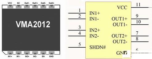 VMA2012模块采用的仍然是VM系列模块常见的PQN-12封装,尺寸为15x18x3.8mm,非常纤小。VMA2012的引脚说明如下: