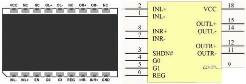 名称 音频功放模块,在负载为8Ω时VMA2013输出功率是6W,VMA2015是15W。在半功率输出时模块的THD+N仅为0.07%。两种芯片外观尺寸和引脚完全一样,因此可以互换使用。模块封装引脚和器件图如下所示: