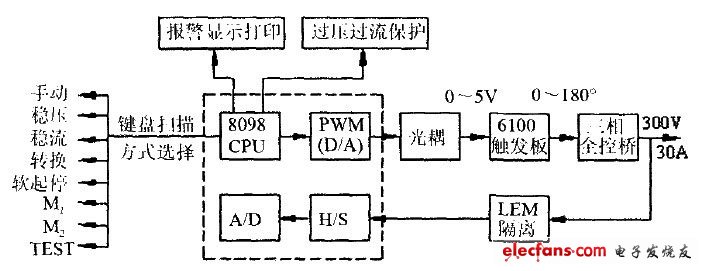 采用软件控制。 2.2 系统整体设计 系统硬件部分由输入输出整流滤波电路、功率变换部分、驱动电路、单片机系统和辅助电路等几部分组成。图1为单片机控制功率直流电源结构框图。 图1 单片机控制功率