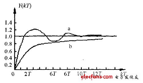 恒偏差法和有效偏差法相类似。有效偏差法又叫逆算法。即当控制量Uk越限时,Uk取边界值Umax或Umin.由该边界值逆算出偏差值Ek'代替原来的偏差值Ek.然而,在恒偏差法中,是用经过衰减后的Ek'去代替Ek.系统在阶跃响应时,实际工作在过阻尼状态,从而减缓了在起、停时对主电路器件的冲击。图3示出两种算法的阶跃输入响应曲线。其中曲线(a)标准PI算法响应曲线、曲线(b)恒偏差法响应曲线。