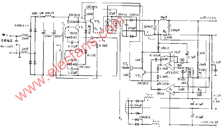 ),然后经整流器整流,最后就可以得到新的、极性和数值各不相同的多组直流输出电压。电路从输出端取样,经放大后反馈至开关控制端,控制驱动电路的工作,最后达到稳定输出电压的目的。这种形式的开关稳压电源在实际