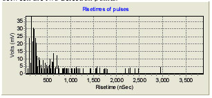 图3所示为33kV纸绝缘电缆的在线检测结果,从图中我们可以看到,电缆的主要上升时间集中在200ns附近。被测电缆长度为2km左右,所有脉冲全部取自于1600m处的一个中间接头。从图中显示的电缆上升时间的分布情况看,各上升时间之间还存在着宽度不等的空白区。理论上,可根据图3画出上升时间的曲线图,纵坐标以米为单位,假定局部放电脉冲上升时间和脉冲在电缆中的传播距离之间存在函数关系。实际上,这种关系也是比较容易建立的,它取决于电缆的类型,而问题的关键就在于电缆终端的测量电路的阻抗是不确定的。如前面所述,当检测电路的阻抗中含有大的感抗时,脉冲的上升时间主要取决于检测电路的阻抗而不是局部放电脉冲的传播距离。在这种情况下,脉冲上升时间和传播距离之间的关系就无法建立。