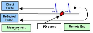 在检测到电缆局放时,如果能对局部放电源进行定位,那么局部放电活动测量的实效性就会大大提高。当局部放电发生时,局放脉冲从放电点向电缆两侧传播(平均速度约150-160m/μs)。首先到达测量端的脉冲是直接向该方向传播的脉冲(直达脉冲),而完成局部放电定位,还要测量向反方向传播后被反射回来的脉冲(反射脉冲),如图4所示: