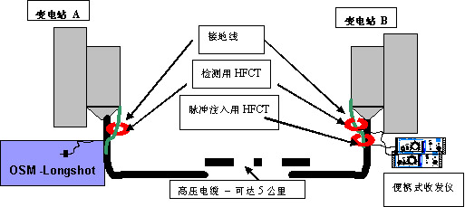 图5所示为使用同步收发仪进行电缆局放定位的示意图,这里利用高频电流传感器作为探测和发射传感器,此系统可用于5km长的电缆。当触发器在上升边沿触发时,设备的精密度决定了局部放电脉冲上升时间的精度。