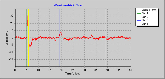 图1 电缆中的局部放电脉冲波形(显示了计算机生成的光标)
