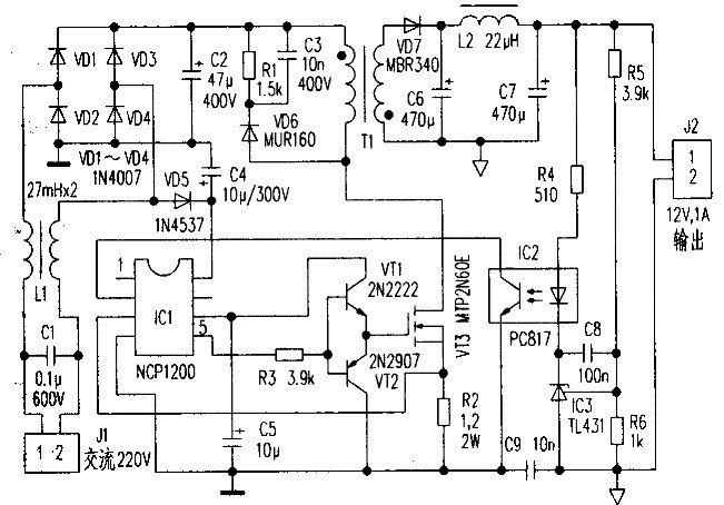 本电路由VD5半波整流作为ICl⑧脚的直流高压电源,这样做的好处是可以降低ICl的功耗,ICl⑤脚输出的脉冲经VTl、VT2推挽放大后驱动VT3,以提高驱动能力。VT3的源极电阻R2决定了峰值电流的调节范围为0.9V/R2~0.35V/R2(即0.75A~0.3A),输出滤波器由C6、L2、C7组成。反馈电路由光耦合器IC2和基准电源IC3构成。其输出电压的数值由电阻R5、R6分压决定,其表达式为:Uo=2.5(1+R5/R6)。