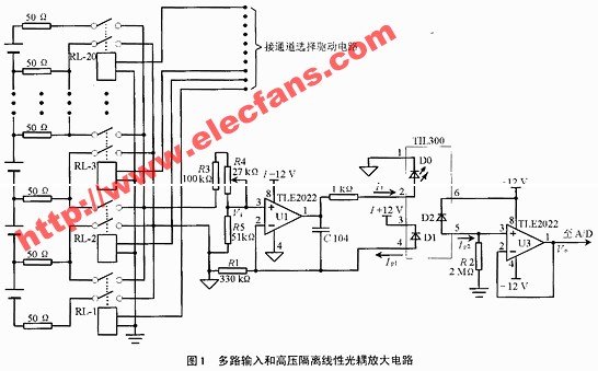 该电路对各路信号进行放大、校正,供A/D转换使用。我们采用线性光耦合放大电路。线性光耦合器件TIL300的输入输出之间能隔离3500V的峰值电压,可以有效地将测量通道与计算机系统隔离开来,使计算机系统避免测量通道部分较高电压的危害,对信号放大的线性度也很好。