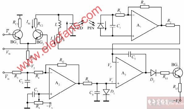输入通道是BG1、BG2、LD、RB、L构成的射极耦合电流开关型LD驱动电路,L是用来阻止脉冲式交流IM流入IB回路。负反馈控制环路则由光检测器件PIN、运算放大器A1和A3、半导体三极管BG3等组成。