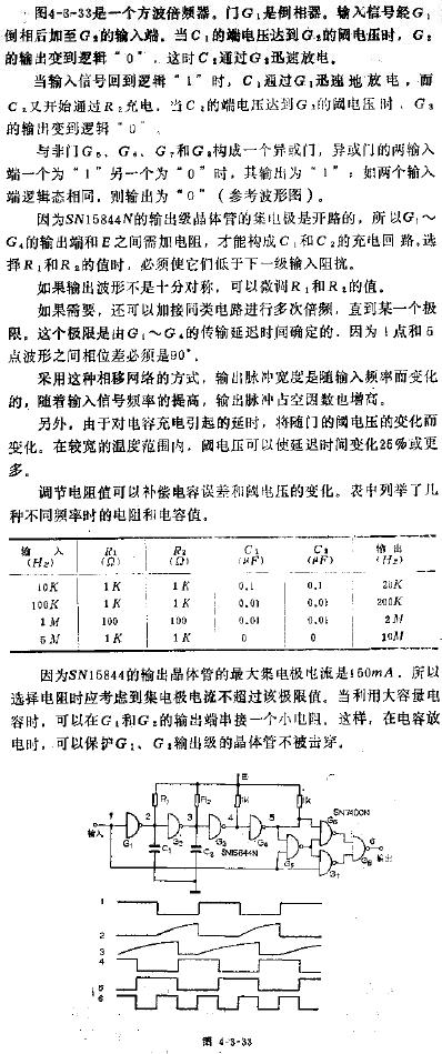 5412 用CMOS门电路组成的脉冲倍频器。其输出脉冲频率是输入脉冲频率的2倍,其电路如图1所示。该线路由两个RC微分电路,一个反向器和一个2输入端与非门组成。各点对应的波形如图2所示。