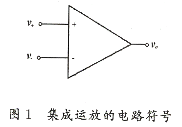大多数集成运放都是双端输入和单端输出的高增益放大器。它的引出端子中,除了两个输入端和一个输出端外,还有两个电源引入端、调零端,还有相位补偿端和其它一些端子。在分析应用电路时,常用带两个输入端和一个输出端的三角符号来代表运算放大器,如图1所示。