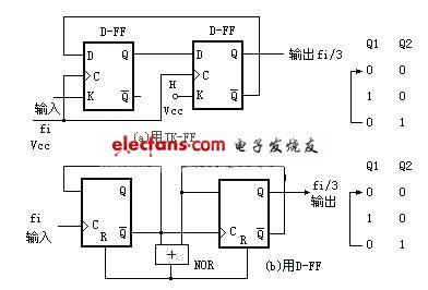 图2是3分频电路,用JK-FF实现3分频很方便,不需要附加任何逻辑电路就能实现同步计数分频。但用D-FF实现3分频时,必须附加译码反馈电路,如图2所示的译码复位电路,强制计数状态