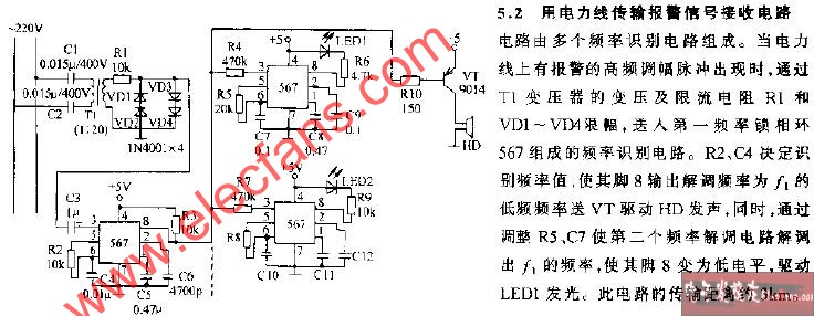 16 这里介绍的报警器无需外接传需线路,靠电力线路传需报警信号。并可设置多处报警点以对某点警情进行声、光报警。用途广泛。 工作原理:
