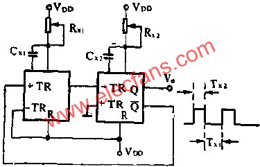 图中所示是用J210组成占空比和频率可调的多谐振荡器线路。它是将两个单稳电路连接起来,每当一个单稳脉冲结束,就促使下一级单稳的外接RX和CX元件来改变振荡频率,同时很容易得到占空比可变的振荡输出。它的占空比可在一个很宽的范围内调节。