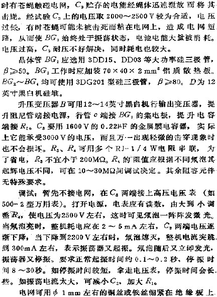 电子灭蝇器利用加在电网上的高压脉冲电压击毙触网的苍蝇。使用时网内设下诱饵以吸引苍蝇,对所有飞到灭蝇网上的苍蝇均能予以杀灭。电子灭蝇器电路如图所示,ICl时基集成电路555与电阻Rl、R2以及电容Cl