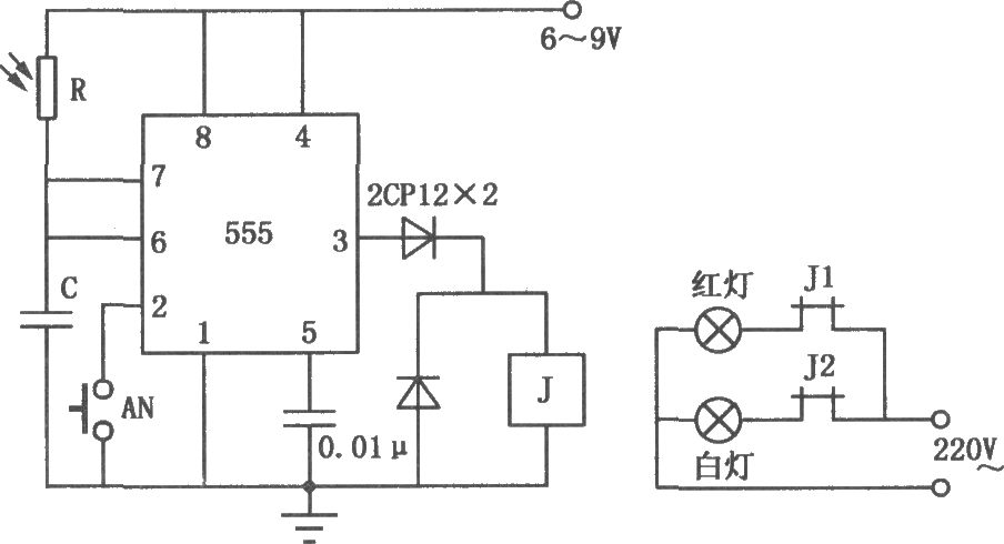 本文是555集成电路构成的自动灯电路图,电源采用78l09三端稳压器,采用555定时器芯片和9014三极管。