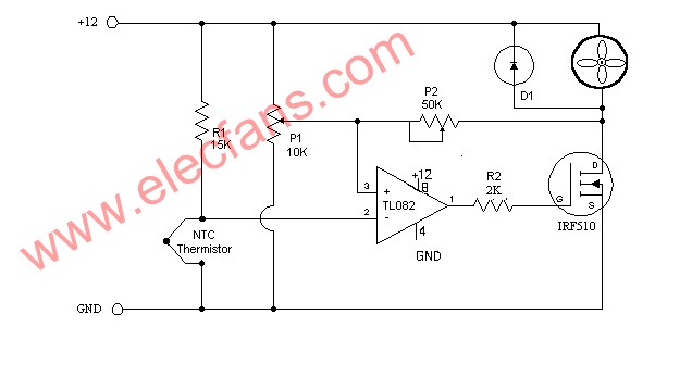 P1 10k ohm potentiometer - sets the low speed(voltage) of the fans at the cool temperature. P2 50K ohm potentiometer - sets the gain of the circuit - how fast the voltage will rise to full output when the temp is higher. TL082 a op-amp that I had handy, most any single voltage op-amp should work. The TL082 is a dual op-amp if you want more then one controller on a board. note that the power and ground connections for the op-amp are not shown on the schematic. R2 - The TL082 is a fast op-amp, needed R2 to reduce oscillation. IRF-510 A 4 amp mos-fet in a TO-220 case. Bascially as the voltage on the gate rises the mos-fet will conduct more current. note 1 there are also IRF-520 and 530 versions that will handle more current. note 2 Even at 5 watts the mos-fet will disapate some heat and will need to be heat-sinked or at least in the air flow path. the large metal part of the fet will be at drain(D) voltage level. Do not attach to case. D1, almost any diode, 1N4001 should work,it conducts back around the fan when the mos-fet turns off. As the fan continues spinning it will produce a voltage on the drain lead of the fet. D1 will limit that voltage. Adjustment, easiest if you have a voltmeter but can be done without. Get the thermistor at room temp. Adjust P1 for the low speed that you want your fans to run at. Heat the thermistor to the high temp you want the fans at full speed. ( I stuck it under my tongue) Adjust P2 until the fans are at full speed( with voltmeter the highest voltage you can get) then adjust P2 until the speed/voltage just begins to drop off. Most fan specs that I have seen show a low voltage limit of around 7 volts. Some of the smaller 80mm fans have a lower limit of 8 volts. If you set the low voltage to low the fans may stall until the thermistor heats up enough. Let me know if you build this circuit and how it works for you. corrected, single voltage op-amps should be used, OP-07 is a dual voltage.