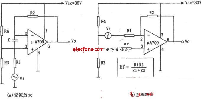 显然,图(b)对于双电源放大电路,其失调电压很小,可以忽略。即当输入电压为零时,其输出电压也近似为零。但是,对于单电源直流放大电路,当输入电压为零时,其输出电压不为零。当输入电压Vi不为零时,其输出电压为: