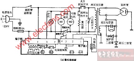分享微波炉的工作电路原理图,微波炉的电路组成与工作原理,家用微波炉基本上都采用箱式结构,一种普及型微波炉电路的电路结构与电路原理图。