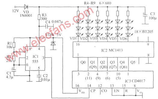 元器件选择:IC1选用555时基集成电路,IC2选用MC1413集成电路,IC3选用CD4017集成电路。VDW选用2CW104稳压二极管,VD1~VD6选用BT205发光二极管。其他元器件如图所示。