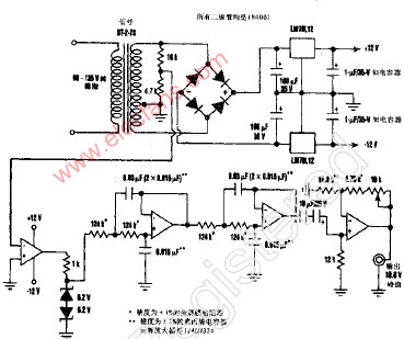 如下图所示为输出稳定的正弦波信号源。首先利用一级运放比较器,产生一个恒定幅度的60Hz方波。比较器的输出端有一对背对相接的6.2V齐纳二极管。