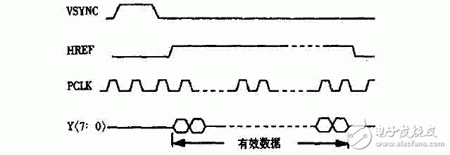 VSYNC是垂直场同步信号(也是每帧同步信号,CMOS是按列采集图像的),其下降沿表示一帧图像的开始,HREF 提供了一种有效的控制方式,当输出像素行列分别处于设定窗口之间时HREF 为有效高电平,此时输出有效的视频数据,PCLK是输出数据同步信号,上升沿输出一个有效的像素Y[7∶M]。
