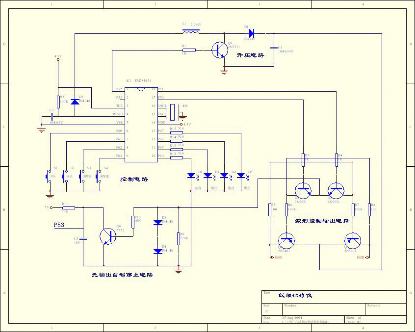 低频脉冲电流主要有三种生理和治疗作用:1、兴奋神经肌肉组织2、促进局部血液循环3、镇痛这三种重要作用。近年来,市场上出现了许多的低频治疗仪。该电路能输出各种模拟人手的按摩手法,强度可调,而且有多种