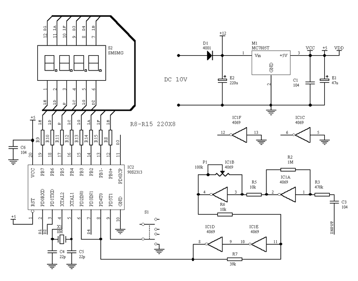 ,AT90S2313则是一块精简指令的高速单片机,它在8M时钟下的性能超过了51系列在100M时钟下的性能,在电路中担任测量、运算和显示驱动。大多数的数显频率计采用一个“秒闸门”计数,因而在低频时测量误差加大,也无