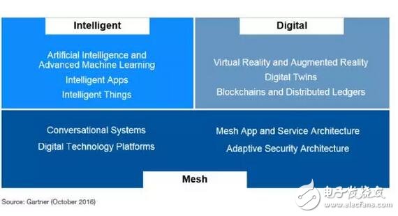 1706 Gartner副总裁暨院士级分析师David Cearley指出:“Gartner列出的2017年十大策略性科技趋势,将为智慧数位网格(Intelligent Digital Mesh)奠定