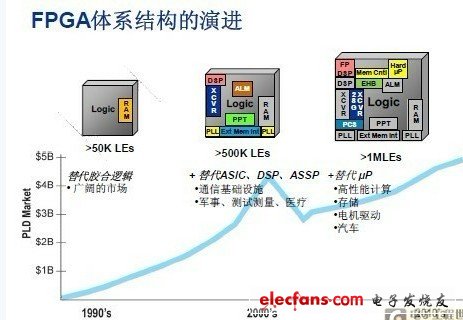 根据英特尔的报告,英特尔也在找类似的硅片融合的方案。Altera也有硅片融合的趋势,如果FPGA中集成了处理器,会同时兼具硬件与软件的灵活性。同时,如果是我们把ASIC跟ASSP的一些特性加到我们FPGA,我们又可以为这个系统带来更高的功效,更低的成本,这就是我们硅片融合的一个趋势,这里面有处理器,有DSP,有专用的IP。当然加上可编程的架构,这就是硅片融合时代的混合系统架构。