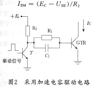 1.1.1 用加速电容以减小三极管的开通与关断时间。如图2为采用加速电容的驱动电路原理图。正向驱动时,C将R1短路,可以给GTR提供峰值较大的初始强驱动电流为: