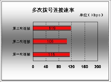下面是连入Internet的多次拨号连接速率,平均速率在113Kbps左右。当然,由于无线信号不能象有线信号那么稳定,而且实际的上网速度也因地域的不同以及笔记本电脑的配置不同而有所区别,即使是通过“CDMA手机+笔记本”与通过“CDMA1X无线网卡+笔记本”上网也有很大的区别。我们这里的测试数据来自广东省广州市天河区,测试用的笔记本电脑是腾龙X71的C-M那一款,下面包括后面的数据仅供参考。