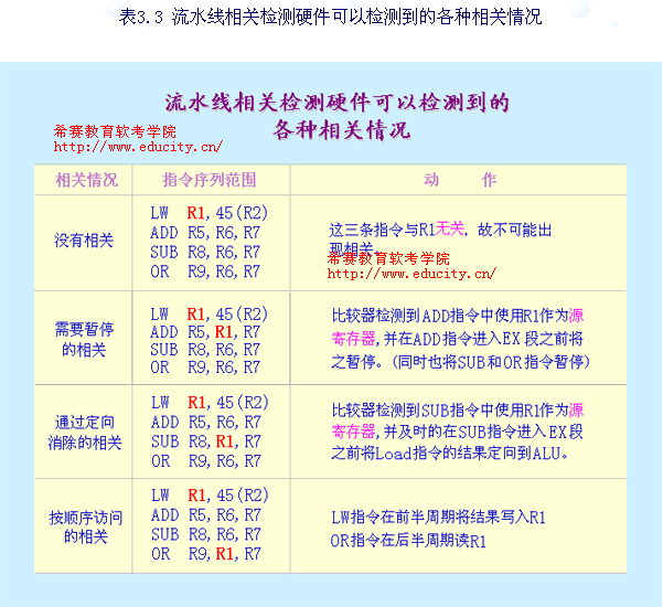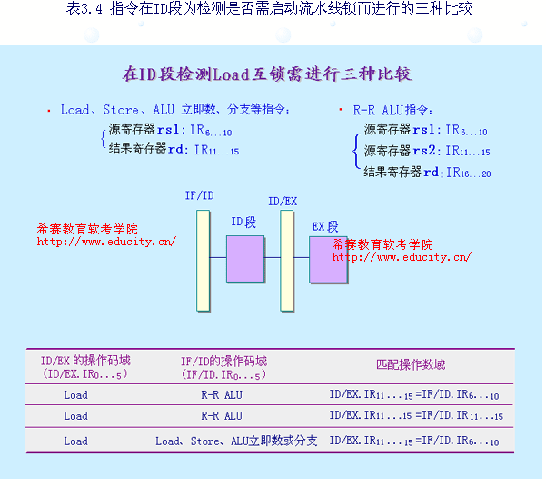 为了说明这两种方法的不同,我们将以 Load 指令所引起的 RAW 相关为例,论述如何通过在 ID段 的检测来实现流水线控制,其中到 ALU 输入的定向路径可以在 EX 段。表3.3列出了流水线相关检测硬件可以检测到的各种相关情况。