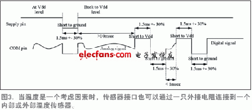不过,如果应用中传感器周围温度与接口周围温度不同,则最好只用一个外接温度传感器。将外接电阻连接到用于调整偏置和增益的温度链上,接口就可以在必要时完成精确的10位温度测量(图3)。这样可以将外接温度传感器尽量靠近压力传感器安装。