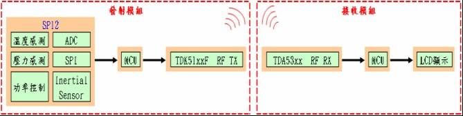 1.发射模块:(1)感测单元(2)讯号处理(3)RF模块