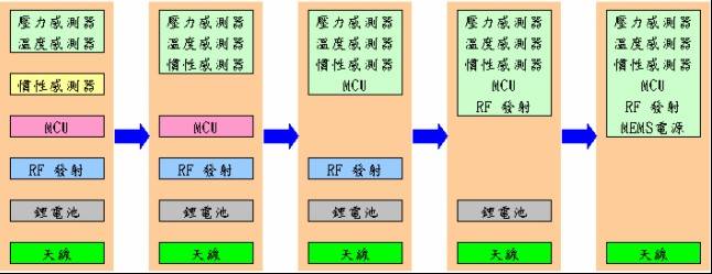 发展TPMS主要考量有:低功耗、配重(牵涉使用组件数量的多寡及体积)、成本。功耗跟电池使用寿命有绝对关系;而配重则牵涉到TPMS发射模块的安装。故TPMS设计方案的发展也依此考量为蓝图(请参考下图)。为降低功耗,设计趋势第一步走向内建惯性传感器,侦测到车辆移动才唤醒发射模块藉以节省电能,最终目标走向无电源模块,即内建MEMS电源以提供电能。至于配重及成本,整合型芯片为设计趋势。整合胎压传感器与MCU,再将RF发射也包含进来,至最后将MEMS也设计在一起,不但可减小模块体积,也节省成本提高市场竞争性。