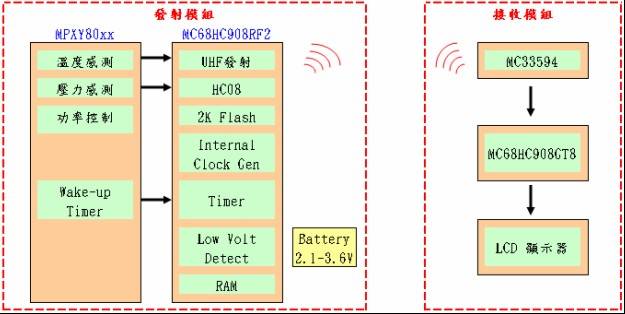 发射模块由胎压传感器MPXY80xx及内含射频发射的微控制器MC68HC908RF2组成,MPXY80xx工作在2.1-3.6V,具有低功耗的效能以延长电池寿命。并整合MCUwake-uptimer与自身的低频震荡器。此外,其输出为8bit数字输出,并已经与MC68HC908RF2完成接口最佳化。接收模块主要由射频接收芯片MC33594及微控制器MC68HC908GT8及相关的外围线路组成。接收灵敏度为90dBm,因为讯号发射时间很短,加上每个发射单元都有其独特ID,就由此可减少汽车EMI的干扰影响。