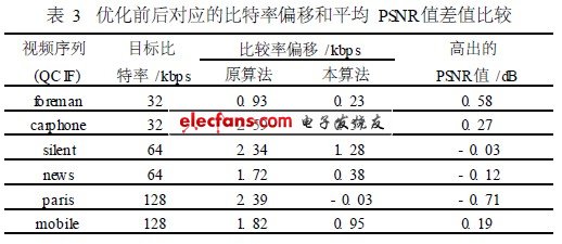 表2给出了标准中原码率控制算法和本文提出的算法对于六种标准序列在不同目标码率和帧率下的实际编码码率和平均重建图像的峰值信噪比PSNR值的测试结果;表3给出了原标准算法和本文算法对应的比特率偏移与平均PSNR值差值比较。