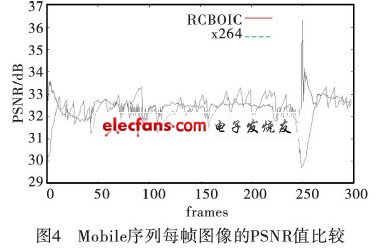 为了进一步对比改进算法的效果,本文将视频序列每帧的PSNR值通过坐标图的形式给出,图中横坐标为帧的编号,纵坐标为对应的PSNR值。本文中给出了具有mobile(码率限制较高比特128kbps)的视频序列PSNR图,如图4所示,即限定码率分别为32kbps、64kbps和128kbps的典型视频。从图4中可以看出,改进算法的PSNR值波动相对较小,从而在视觉上不会感觉到明显的图像质量变化,这就保证了图像质量的平稳过渡,具有较高的主观视觉质量。